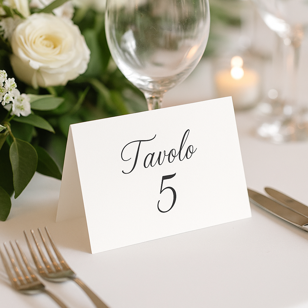 Personalizzabili con nomi dei tavoli, numeri, illustrazioni o grafiche a tema, si abbinano perfettamente a partecipazioni, menu e libretti messa coordinati.