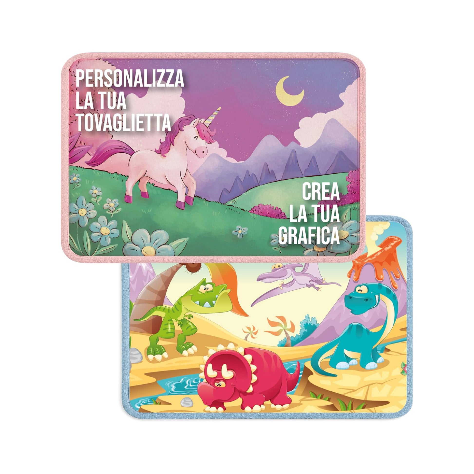 Tovaglietta in spugna assorbente personalizzabile con stampa digitale ad alta risoluzione. Ideale per la colazione, per la scuola o per l'uso quotidiano, misura 40×30 cm ed è rifinita con bordi colorati disponibili in rosa o azzurro. Lavabile in lavatrice, è perfetta come regalo o gadget utile e originale.